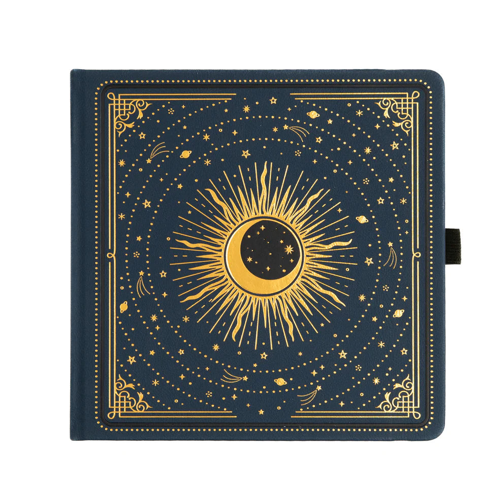 Celestial Cover Design: Soft vegan leather cover in deep navy, featuring serene starry artwork with a mix of debossing and shimmering silver foil details.