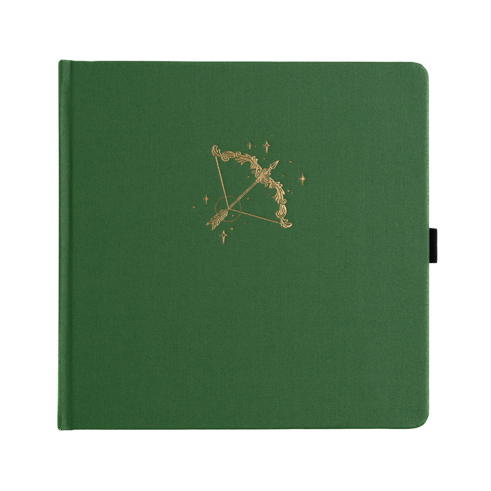 Simple, timeless, and powerful, The Archer Square Notebook by Archer & Olive brings quiet elegance to your creative routine. Its deep green buckram cover features a delicate gold-foil bow and arrow design, paired with a coordinating spine and patterned end pages for a classic, refined aesthetic.